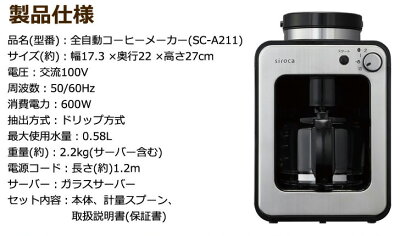 siroca 全自動コーヒーメーカー SC-A211 全自動コーヒーメーカー オートコーヒーメーカー 挽きたてコーヒー 粉【送料無料】
